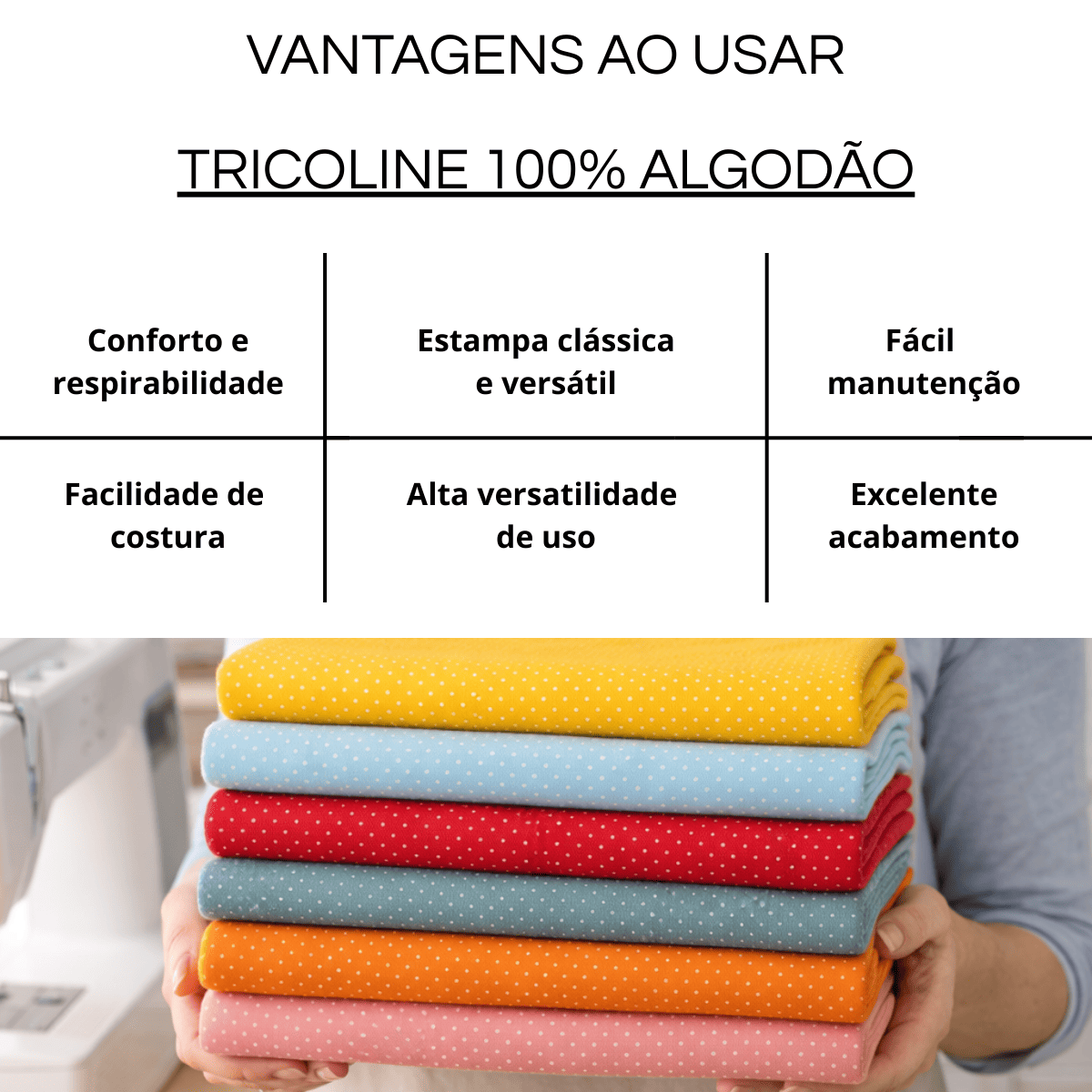O tecido 100% algodão liso ou estampado é um tecido muito fácil de costurar por ser um tecido leve e plano dando maior facilidade para o desenvolvimento de novas peças.